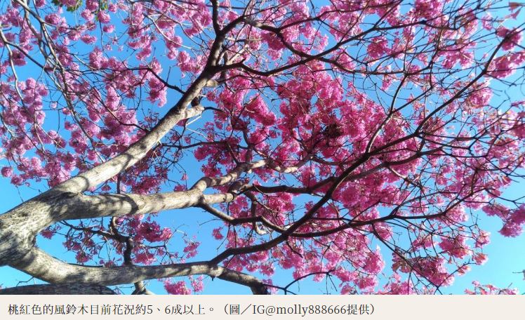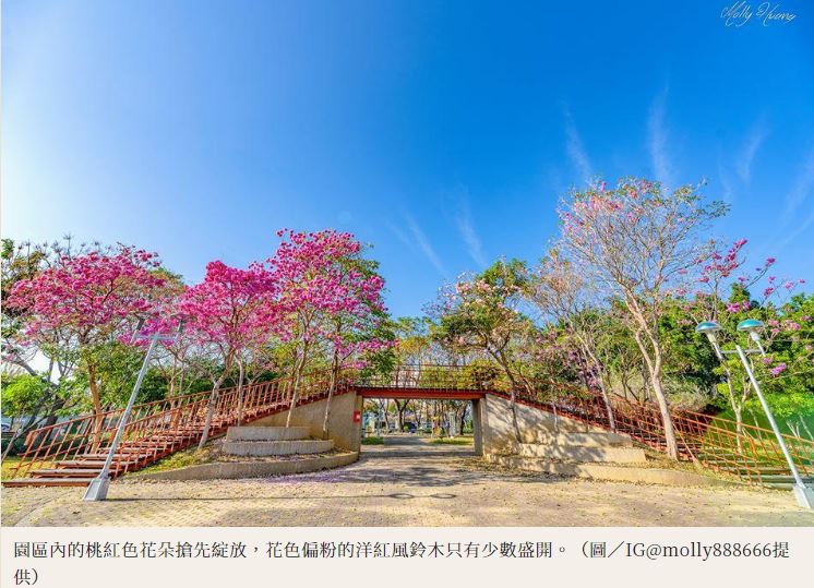 台中三甲公園種植了10幾棵洋紅風鈴木,每到花開季節,就成為人氣爆棚的拍照打卡熱點,目前園區桃紅色花況達5成以上,顏色較粉的花朵仍屬含苞待放的狀態,實際前往拍攝的IG網紅莫莉也分享,雖然此處的花樹數量不算多,但紅色木橋襯著粉紅花海,飄著日式氣息,讓人彷彿身在唯美的愛情劇場景,也應景捎來濃濃喜氣。今年花況比去年還要美,可趁著好天氣趕快搶拍,否則過幾天下雨就會落花滿地了。