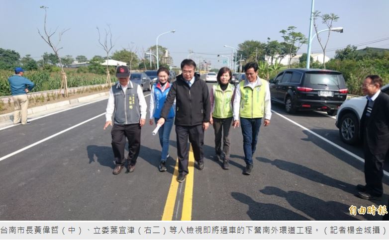 台南市長黃偉哲、立委葉宜津今天特別到下營南外環道檢視工程品質,市議員陳秋宏、吳通龍、下營區長姜家彬和地方里長對南外環即將通車的喜事都很開心和期待,黃偉哲說,市府興辦工程不只要如質如實完成,且好還要做的更好。