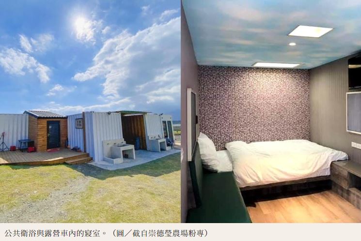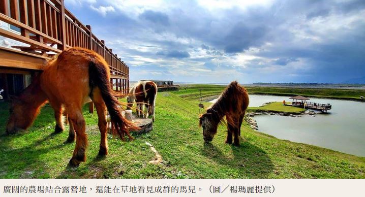 遊客可以選擇在水泥平台或是草地上搭帳篷,喜歡豪華度假感的人,可入住盥洗住宿設備一應俱全的露營車,寬敞的房型有如民宿套房,每晚約3500元,還能到露台享受無光害夜景、數星星。「崇德瑩農場」鄰近崇德海邊、立霧溪出口,園區整修後重新開放,廣闊的河口海灣配上蟲鳴鳥叫聲,以及馬兒、孔雀、烏龜和小鴨等動物增加活潑氛圍,不只適合親子同遊,悠閒的慢步調帶著長輩,或是年輕人揪團露營也很適合。