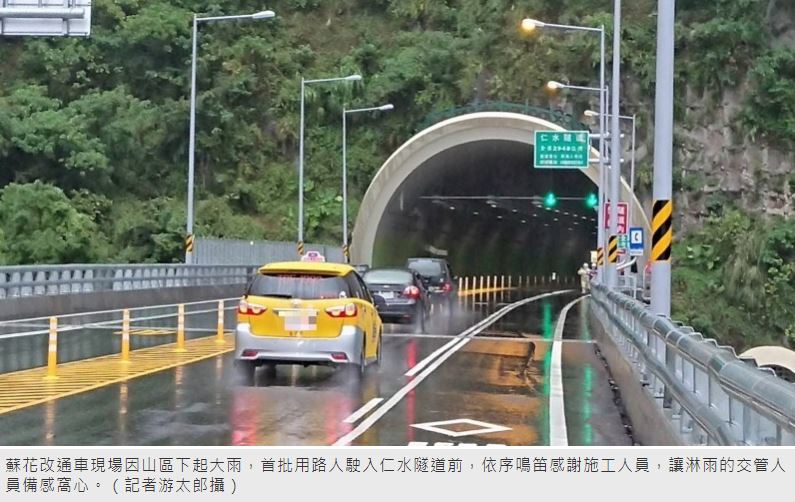 蘇花改今下午4時全線通車,花蓮縣境內、仁水隧道南口為新舊蘇花交界,期待體驗蘇花改的駕駛,不到4時已在路廊等候,待工程人員放行後,依序北上駛入隧道。由於山區下起大雨,首批用路人駛入隧道前,還長鳴喇叭致敬,讓淋雨的施工交管人員備感窩心。