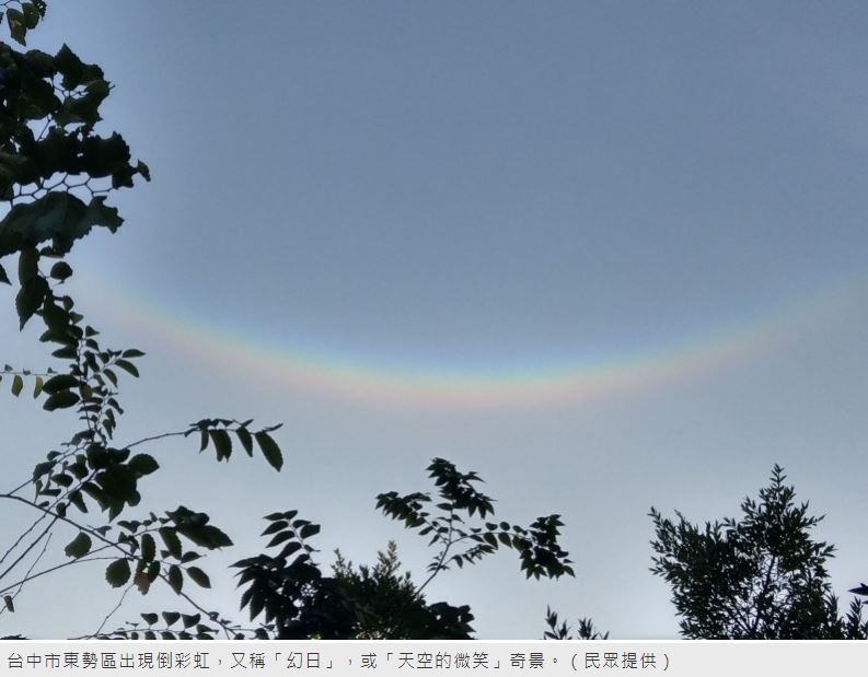 陳姓民眾今天上午在台中市東勢區拍到倒彩虹,十分新奇;台中氣象站表示,倒彩虹是因6000公尺高空中有六角柱型冰晶,太陽光經冰晶折射而出現,又稱「環天頂弧」,西方稱為「幻日」,也曾被稱「天空的微笑」,在台灣非常罕見,較常出現在高緯度國家。