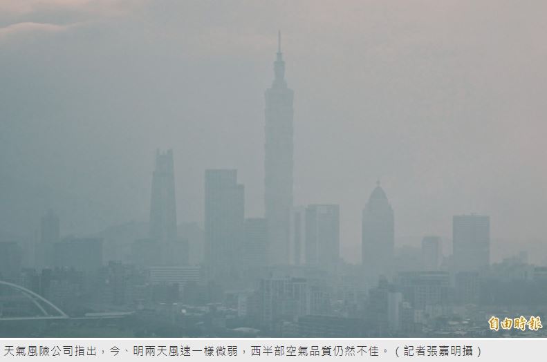 天氣風險公司指出,西半部地區今(6日)、明(7日)兩天風速仍然微弱,空氣品質依舊不佳,是「今年首波嚴重本地污染事件」,建議「台北至高屏」民眾出門要戴上口罩,減少戶外劇烈活動。