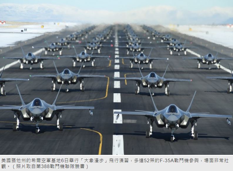 美國猶他州的希爾空軍基地(Hill Air Force Base)6日舉行「大象漫步」飛行演練,多達52架的F-35A戰鬥機參與,場面非常壯觀,也展現出聯隊優異的協同作戰能力。