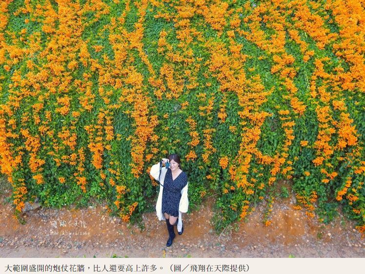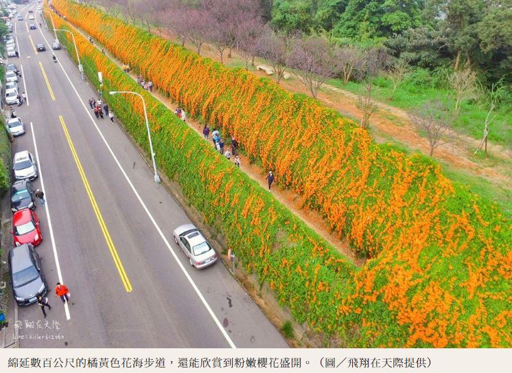 炮仗花因花朵成串、呈現橘紅色,酷似新年燃放的鞭炮而得名,花期約從1月一路美到3月初左右,如同其花語富貴吉祥之意,是農曆新年走春必訪的賞花嬌點!苗栗自多年前開始廣為種植炮仗花,每當花開時節,水泥駁坎或鐵絲網圍籬攀滿成串的花朵,顯得喜氣洋洋,其中又以銅鑼環保公園規模最為壯觀,花海步道綿延1公里長,還能同時觀賞上方的幾株櫻花樹,雙花海一次盡收眼底,空拍美麗繽紛的景色更令人驚豔。