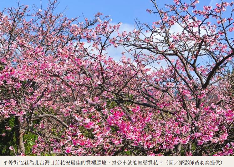 受到暖冬影響,平菁街42巷的寒櫻比往年提早2週報到,極佳的花況吸引不少攝影玩家上山追花,有網友分享現在住宅附近的櫻花,含苞待放居多,約綻放3成左右,而一彎進「狗殷勤古道」巷弄內,立即能望見大片粉紅櫻花海出現在眼前,預估1週內全數滿開,桃紅與粉紅花苞交織,將整條平菁街暈染成繽紛浪漫的櫻之國度,1月底前皆是北部民眾出發賞櫻的大好時機。