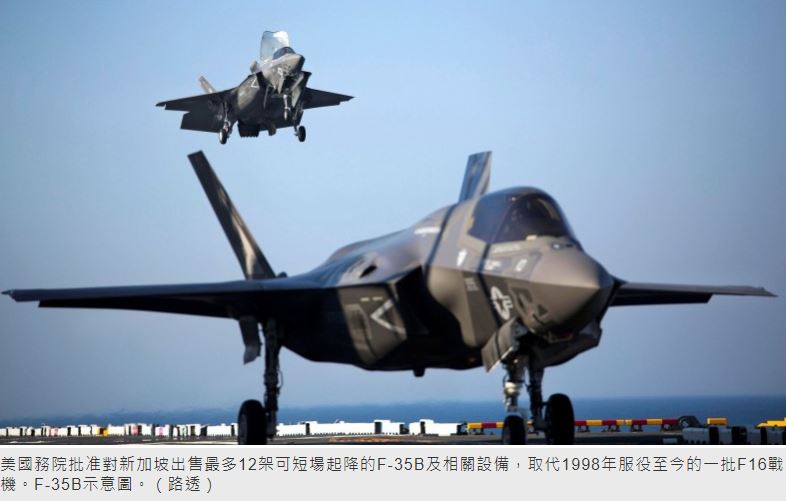 新加坡去年初決定向美採購五代匿蹤戰機F-35,經過雙方密切討論後,美國國防部旗下負責軍售業務的國防安全合作局(DSCA)正式公告,國務院已經批准對新加坡出售最多12架可短場起降的F-35B及相關設備,取代1998年服役至今的一批F16戰機,這份軍售案總價高達27.5億美元大單(約新台幣813.4億)。