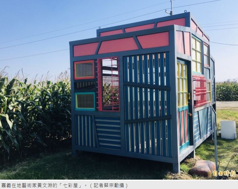 嘉義縣太保市在地藝術家黃文淵的「七彩屋」,是為古笨港戶外考古園區地標而設計,採三角形體等幾何拼裝設計為發想型式,牆面由各式老木門、木料、木窗、鐵窗與老瓦片拼裝出工寮新生命。