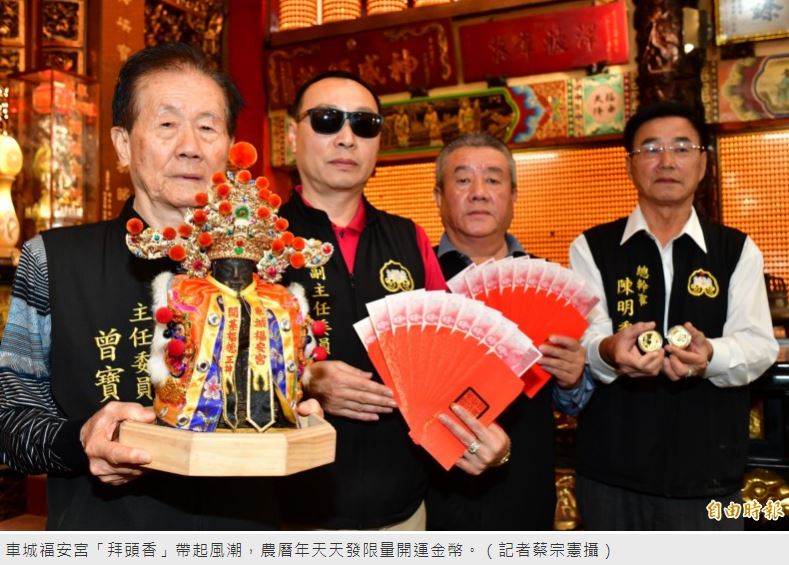 邁入第15個年頭的車城福安宮除夕夜「拜頭香」活動,今年依往年慣例舉辦摸彩、贈送鼠年開運金幣及發財金,廟方也首度在金幣上寫上「土地公祖」字樣,強調福安宮悠久的歷史,歡迎全國民眾到訪為新的一年祈福開運。