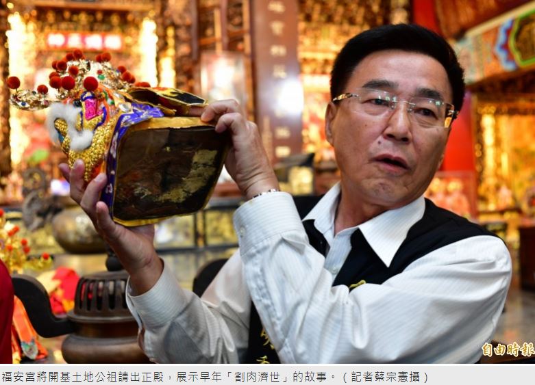 福安宮今天罕見將開基土地公祖請出正殿,展示早年「割肉濟世」的故事,歷史悠久的神像底座,缺了一大塊給信徒做藥引,許多幸運看到的信徒爭相拍照留念,直呼300多年歷史的福安宮土地公祖慈悲。