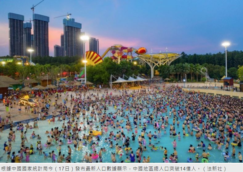 根據中國國家統計局今(17日)發布最新人口數據顯示,中國地區總人口突破14億人,達到14億5萬人,去年增加467萬人,其中男性逾7.15億人,女性約6.85億人,總人口性別比為104.45。