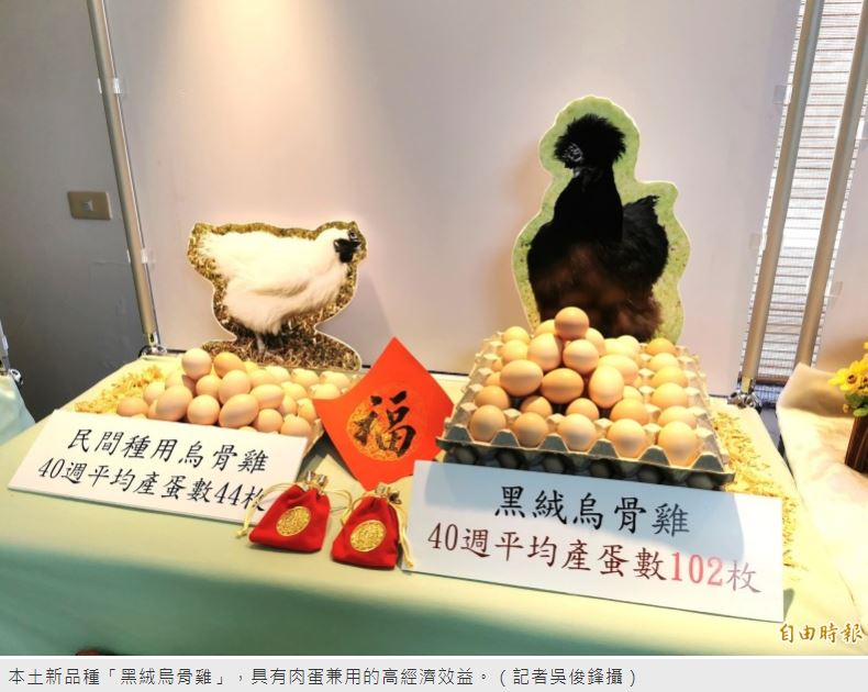參與研發的副研究員劉曉龍表示,黑絨烏骨雞血統純正,未與大型肉雞雜交,保留住細緻的口感,且40週齡產蛋達102枚,遠高於40週齡產蛋才44枚的台灣現有烏骨雞,還有甘甜味,蛋的營養成分,在卵磷脂、維他命、DHA、葉酸、鐵等含量,也比現有烏骨雞多。