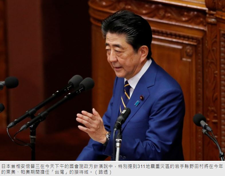 日本首相安倍晉三在今天下午的國會施政方針演說中,特別提到311地震重災區的岩手縣野田村將在今年的東奧、帕奧期間擔任「台灣」的接待城,以表達感謝之意,議場內也響起了一片掌聲。