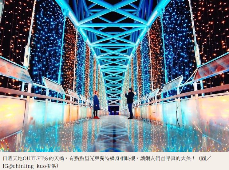 除此之外,熱門逛街地點日曜天地OUTLET、台中大遠百附近的陸橋全都換上新妝,具有藍白曲線造型的「海天橋」、旱溪沿岸夜晚也點上絢麗的燈飾,過年走春玩台中,數十個絕美天橋景點,正好可以一次蒐集!