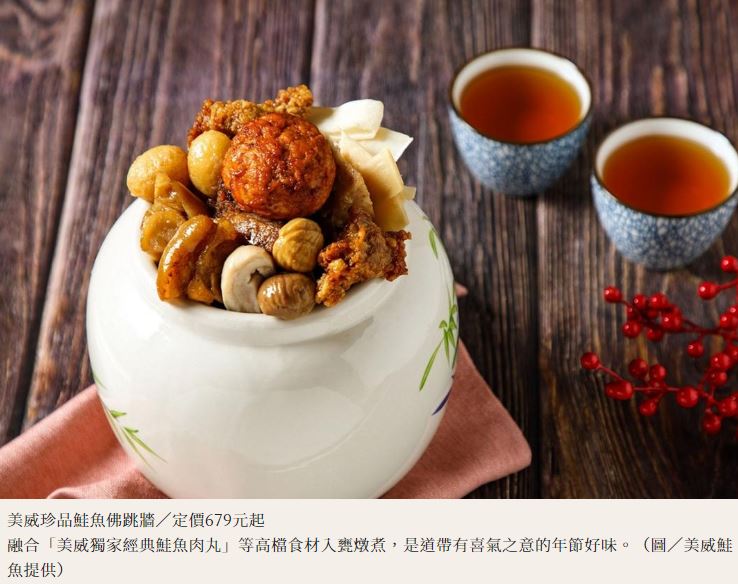 美威鮭魚全新外帶年菜系列,包括以老母雞、排骨酥、豬腳慢火熬製上湯,融合「美威獨家經典鮭魚肉丸」等高檔食材入甕燉煮,將珍饈匯集於一鍋的「美威珍品鮭魚佛跳牆」;還有結合海陸一品湯底以及嚴選高品質鮮厚鮭魚頭、鮭魚干貝海鮮丸、鮭魚手工蝦捲、當令新鮮時蔬的「美威一品鮭魚海鮮鍋」;另推出突破一般以豬肉為主餡的製程傳統,將鮭魚與紅藜麥雙項超級食物打造的「美威鮭魚紅藜麥油飯」,只要在家依照指示慢火燴煮或電鍋蒸煮,30分鐘內就能輕鬆為家人做出一桌鮭魚饗宴,讓今年年菜吃得營養又美味!